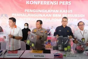 BPH Migas bersama dengan Direktorat Reserse Kriminal Khusus (Ditreskrimsus) Polda Jawa Timur selenggarakan Konferensi Pers “Pengungkapan Kasus Penyalahgunaan BBM Bersubsidi” bertempat di Kantor Polda Jawa Timur (23/02).Sebesar 45,5 Ton BBM Bersubsidi Jenis Solar berhasil diungkap dan 27 orang telah diamankan. Pengungkapan kasus ini sebagai salah satu giat BPH Migas bersama dengan Kepolisian Republik Indonesia untuk memperkuat kinerja dalam penegakan hukum di bidang hilir migas.