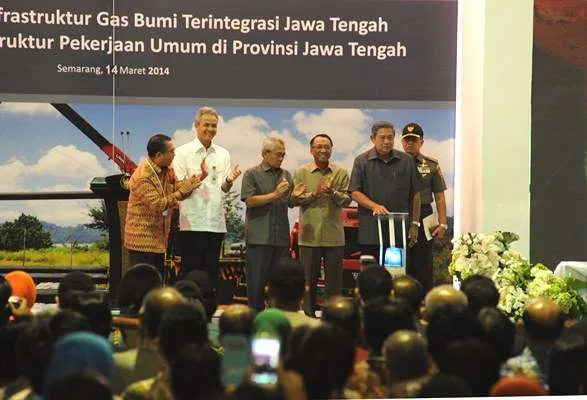 SEMARANG. Presiden RI Susilo Bambang Yudhoyono, didampingi Menteri ESDM Jero Wacik, Menteri PU Djoko Kirmanto, Kepala BPH Migas Andy Noorsaman Sommeng dan Gubernur Jawa Tengah Ganjar Pranowo, Jum’at (14/03/2014) menekan tombol sirine sebagai tanda dimulainya ground breaking Infrastruktur Jaringan Pipa Transmisi Gas Bumi Kalimantan-Jawa (Kalija) tahap I dari Lapangan Gas Kepodang menuju Pembangkit Listrik Tenaga Gas-Uap (PLTGU) Tambak Lorok, Semarang, Jawa Tengah.
